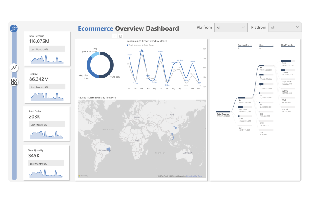 Biến những bảng biểu phức tạp thành hệ thống Dashboard thông minh. Chúng tôi giúp bạn chuẩn hóa dữ liệu, tối ưu hóa hiển thị và truyền tải Insight giá trị, giúp bạn luôn tự tin ra quyết định và tỏa sáng trước ban lãnh đạo.