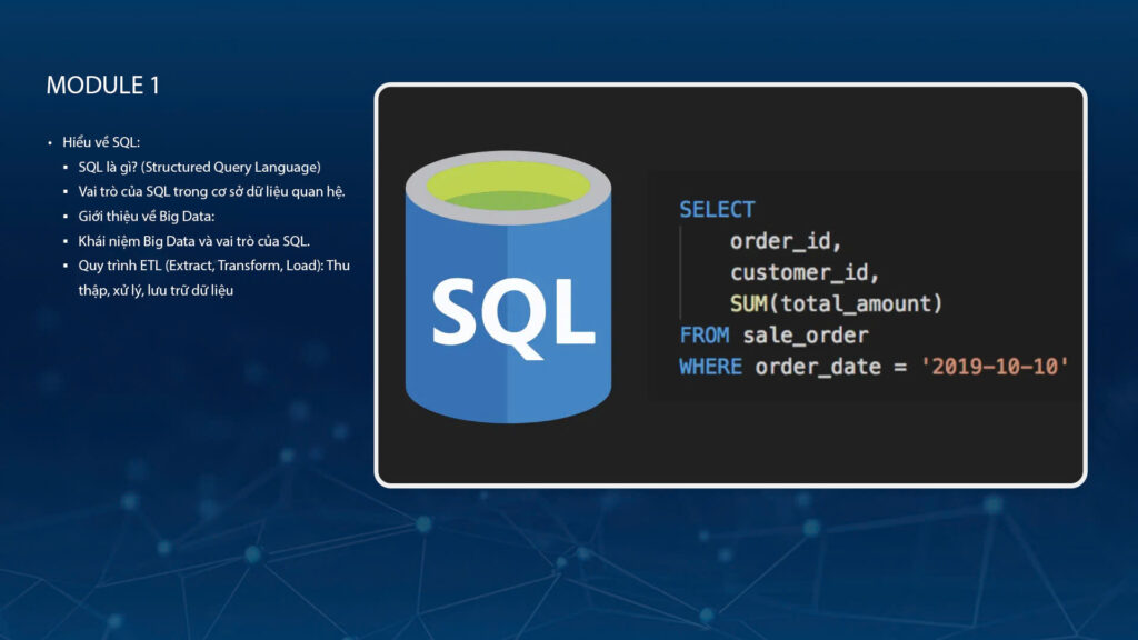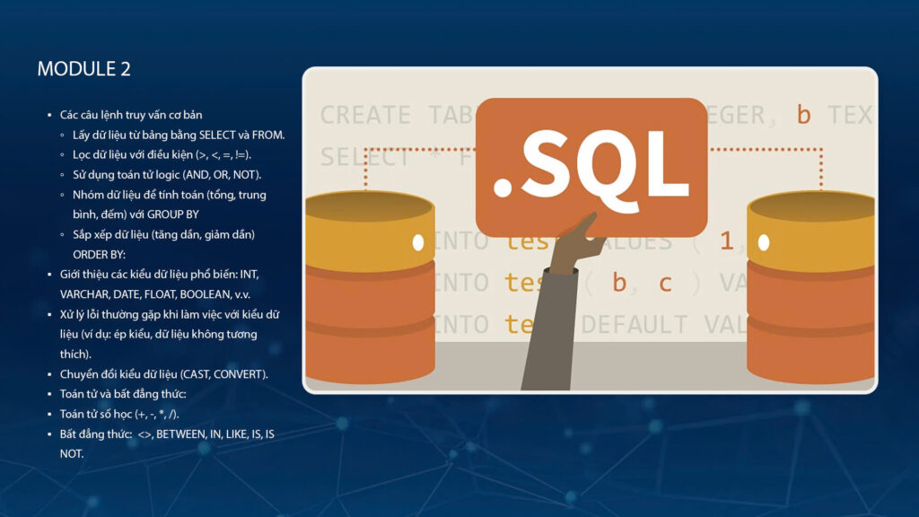 Nắm vững các câu lệnh SQL cơ bản (SELECT, WHERE, GROUP BY, HAVING, ORDER BY), hiểu rõ về kiểu dữ liệu và cách sử dụng chúng hiệu quả, đồng thời thành thạo các toán tử và bất đẳng thức để thực hiện truy vấn dữ liệu chính xác và tối ưu. Module này cũng đặt nền tảng cho việc xử lý dữ liệu phức tạp hơn trong các module tiếp theo.