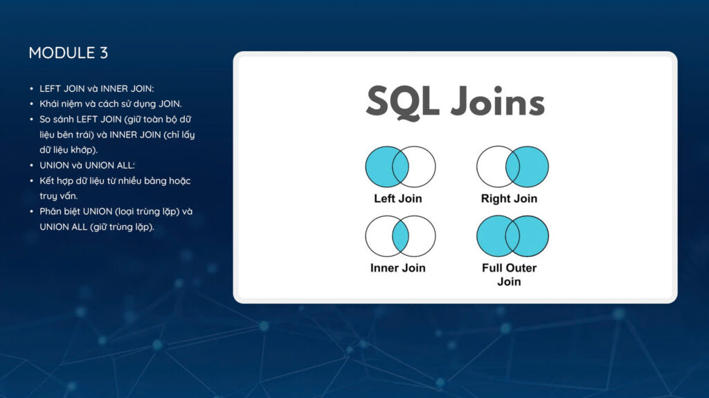 Nắm vững các kỹ thuật kết hợp dữ liệu bằng JOIN (LEFT JOIN, INNER JOIN) và UNION/UNION ALL, hiểu rõ sự khác biệt và ứng dụng của chúng, đồng thời phát triển khả năng xử lý các truy vấn phức tạp để chuẩn bị cho việc làm việc với cơ sở dữ liệu quan hệ trong thực tế.