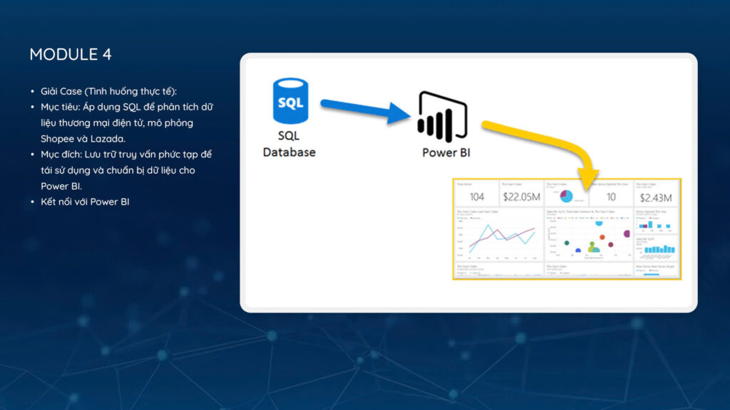 Áp dụng SQL để giải quyết các bài toán thực tế trong lĩnh vực thương mại điện tử, sử dụng View để tổ chức dữ liệu hiệu quả, và kết nối dữ liệu với Power BI để tạo ra các báo cáo trực quan, từ đó phát triển kỹ năng phân tích và trình bày dữ liệu chuyên nghiệp.