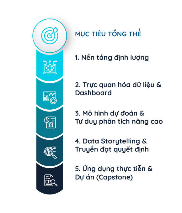 Khóa học được xây dựng trên nền tảng 5 tầng năng lực – từ xử lý dữ liệu cơ bản đến truyền đạt insight ở cấp độ chiến lược. Đây là hành trình giúp bạn chuyển hóa kiến thức kỹ thuật rời rạc thành tư duy phân tích toàn diện, phục vụ ra quyết định trong môi trường kinh doanh thực tế.