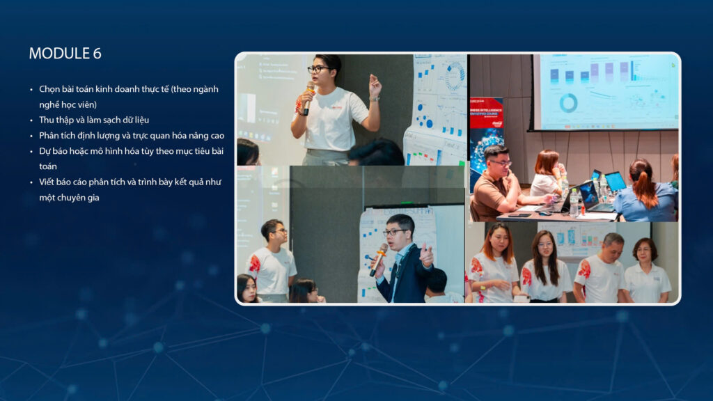 Giải quyết các bài toán cụ thể như dự báo doanh thu, phân tích nhân sự, marketing qua dữ liệu.