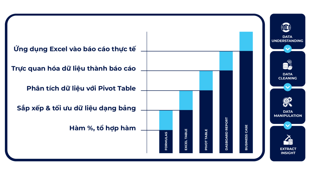 EXCEL FOR BUSINESS ANALYTICS – là khóa học thực hành chuyên sâu giúp bạn làm chủ Excel như một công cụ phân tích dữ liệu mạnh mẽ trong môi trường doanh nghiệp. Không chỉ học cách sử dụng công thức hay tạo báo cáo, bạn sẽ được ứng dụng Excel vào thực tế công việc như xử lý dữ liệu, tạo dashboard tương tác, và đưa ra các quyết định dựa trên dữ liệu.