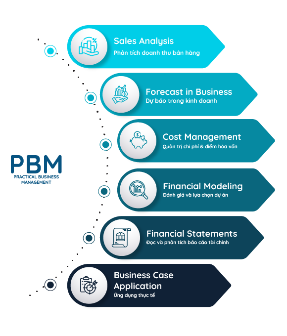 Khoá học PRACTICAL BUSINESS MANAGEMENT được thiết kế nhằm giúp học viên xây dựng nền tảng vững chắc về tư duy tài chính quản trị, qua đó nâng cao khả năng phân tích và ra quyết định trong môi trường kinh doanh thực tế. Thông qua các nội dung trọng tâm như phân tích doanh thu, quản trị chi phí, mô hình hòa vốn, phân tích báo cáo tài chính, mô hình tài chính và dự báo kinh doanh, học viên sẽ nắm bắt được bức tranh toàn diện về hiệu quả hoạt động của doanh nghiệp.