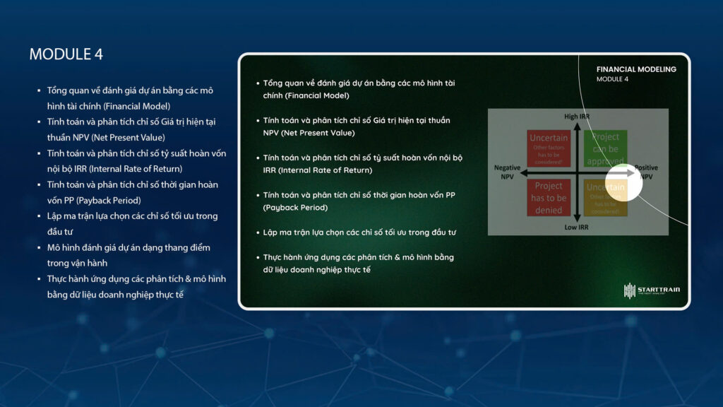 Nắm vững các mô hình tài chính để đánh giá dự án (NPV, IRR, PP, ma trận lựa chọn, mô hình thang điểm), hiểu cách tính toán và phân tích chúng, đồng thời áp dụng vào dữ liệu thực tế để hỗ trợ ra quyết định đầu tư hiệu quả và giảm thiểu rủi ro.