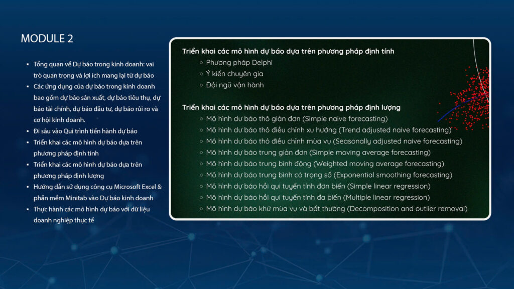 Hiểu vai trò và lợi ích của dự báo trong kinh doanh, nắm vững các ứng dụng, quy trình và mô hình dự báo (định tính và định lượng), thành thạo sử dụng Excel và Minitab, đồng thời áp dụng kiến thức vào thực tế thông qua các bài tập với dữ liệu doanh nghiệp, từ đó hỗ trợ ra quyết định chiến lược hiệu quả.
